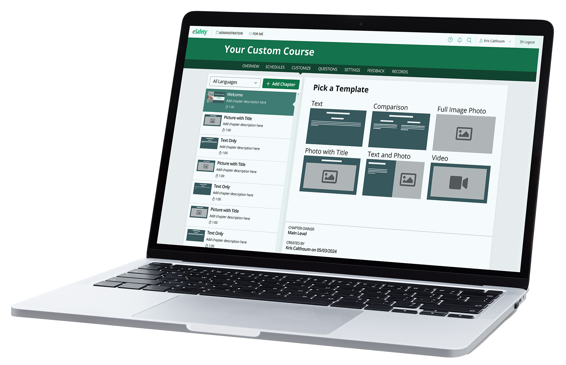 Build fully custom courses using the eSafety Course Builder. Pre‑formatted chapter templates make course creation easy, with built‑in options for adding text, images, video, and audio.