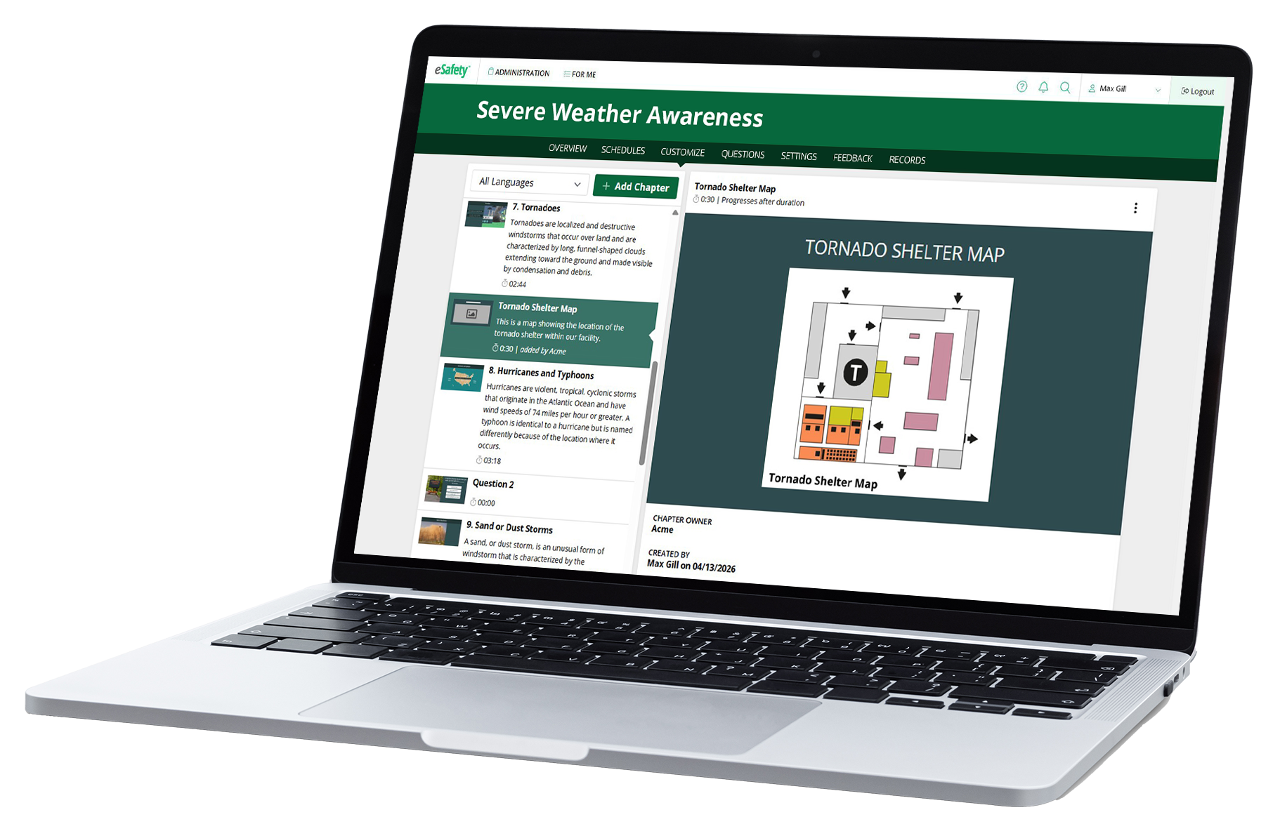 Add custom chapters to any eSafety enhanced course to incorporate site‑specific information directly into the course. Incorporate custom test questions to confirm learner understanding.